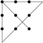 En este acertijo, la instrucción es unir todos los puntos con una línea recta sin despegar el lápiz y sin regresar sobre una línea ya trazada. La percepción natural es ver esto como una cuadro. La solución implica dejar de ver la imagen como un cuadro; de ahí que la expresión pensar fuera de la caja se relacione mucho con este ejemplo.